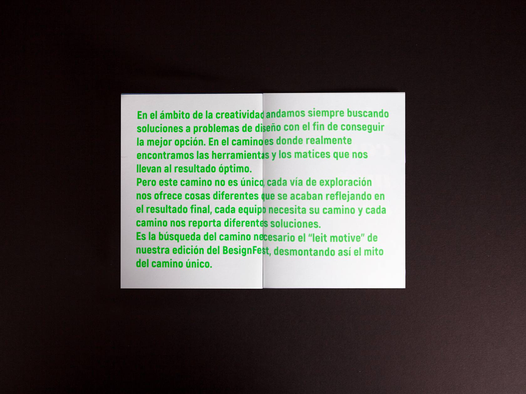 En el ámbito de la creatividad andamos siempre buscando soluciones a problemas de diseño con el fin de conseguir la mejor opción. En el camino es donde realmente encontramos las herramientas y los matices que nos llevan al resultado óptimo. Pero este camino no es único, cada vía de exploración nos ofrece cosas diferentes que se acaban reflejando en el resultado final, cada equipo necesita su camino y cada camino nos reporta diferentes soluciones. Es la búsqueda del camino necesario el “leit motive” de esta edición del BesignFest, desmontando así el mito del camino único.